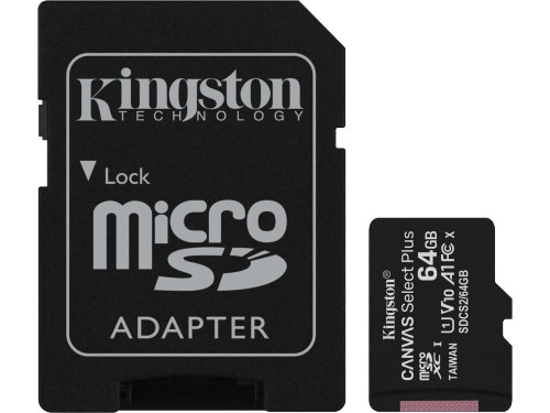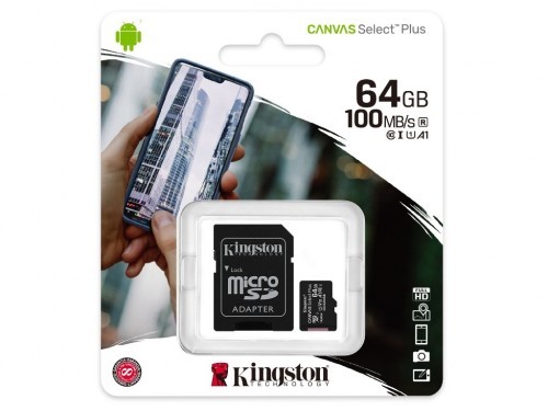 64GB Kingston microSD Class10 UHS-I U1 V10 A1 + SD adapter Canvas Select Plus, Up to: 100MB/s