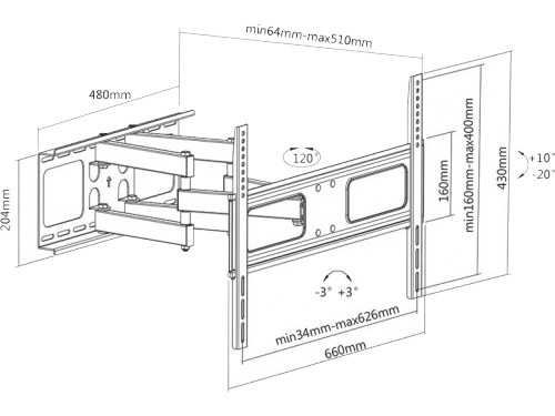 SBOX TV-Wall Mount PLB-3646 for 37-80'', Vesa 600 x 400 ,greutate suportata 50kg ,rotire 120° ,inclinatie -20 la 10°